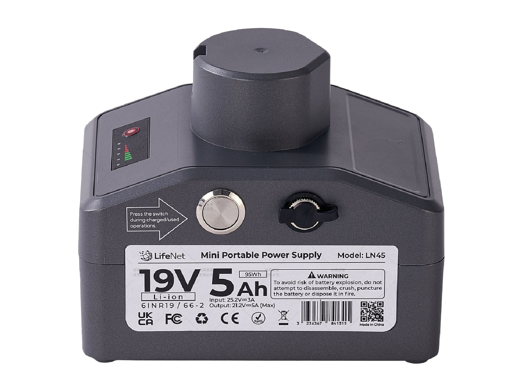 بطارية ليثيوم-ايون 19V بسعة (95wh) 5Ah , خرج 21ز2v حتى 5A , و مدخل شحن 25.2v/3a .