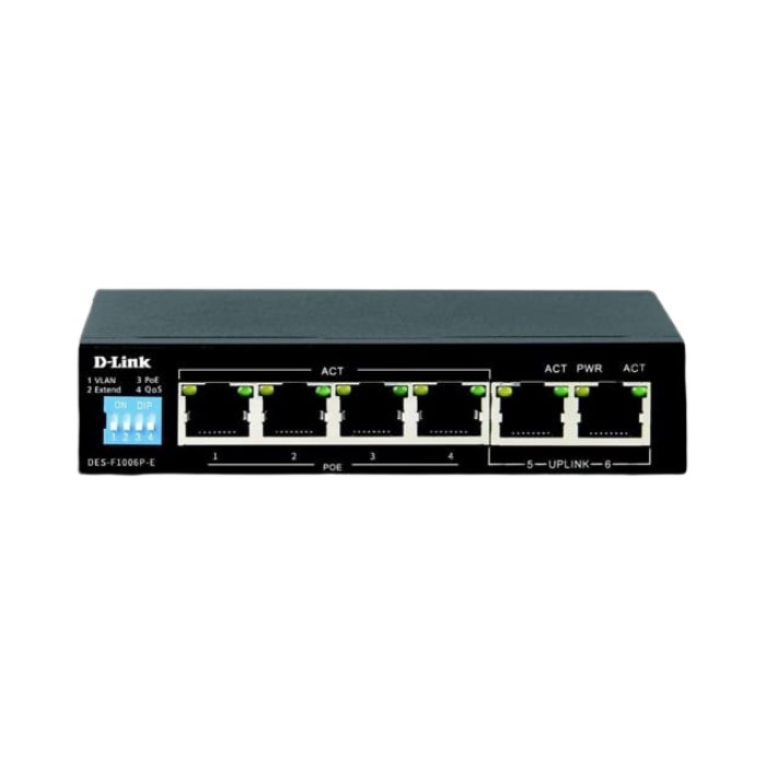 سويتش D-Link DES-F1006P-E يحتوي على ميزة +PoE وبه 5 منافذ وسرعة 100Mbps: 1. عدد المنافذ: يحتوي على 6 منافذ إجمالاً: 4 منافذ RJ45 بسرعة 100Mbps تدعم +PoE، ومنفذ Uplink بسرعة 100Mbps، ومنفذ إضافي uplink بسرعة 1000Mbps (Gigabit). 2. ميزة +PoE: يدعم تقنية PoE+ (802.3af/at) على 4 منافذ لتشغيل الأجهزة مثل الكاميرات ونقاط الوصول بدون محول طاقة خارجي. 3. إجمالي قدرة PoE: يوفر قدرة إجمالية تصل إلى 60 واط لتغذية الأجهزة المتصلة عبر PoE. 4. إدارة: سويتش غير مدار (Unmanaged)، يعمل بمجرد التوصيل دون حاجة للإعداد. 5. تصميم: تصميم معدني قوي مزود بفتحات تهوية، ويحتوي على وضع Extend يصل إلى 250 متر لتوصيل الكاميرات. 6. الحماية: مزود بحماية من زيادة التيار والتحميل الزائد والدوائر القصيرة على منافذ PoE. 7. الاستخدام: مثالي لأنظمة المراقبة بالفيديو (IP Cameras) وشبكات المؤسسات الصغيرة التي تحتاج إلى دعم PoE بسرعة 100Mbps.
